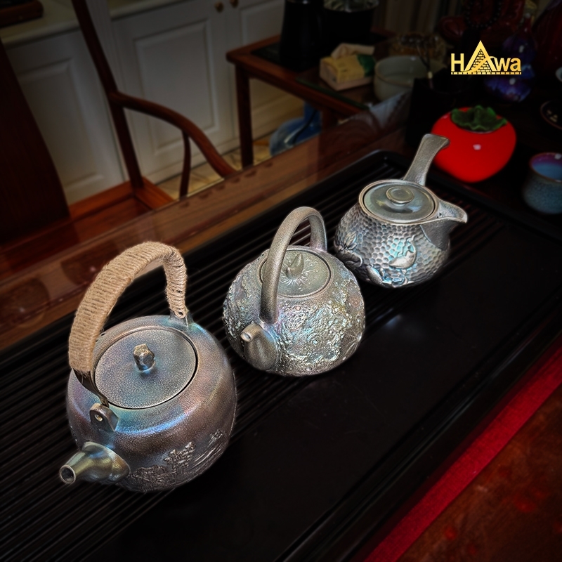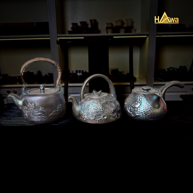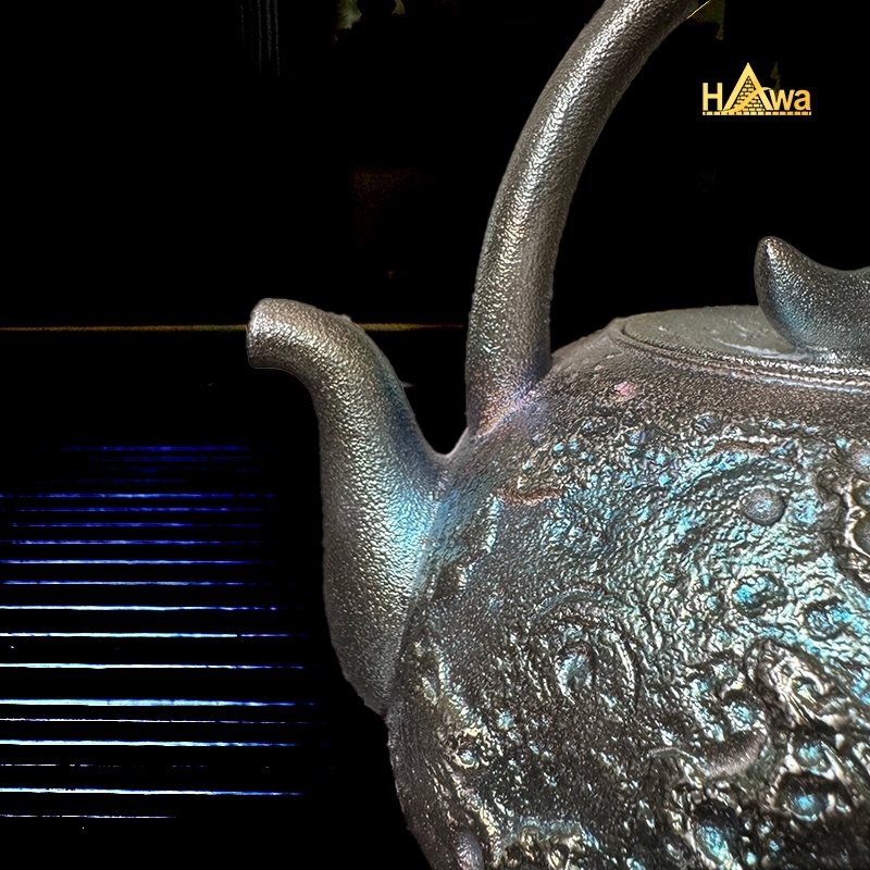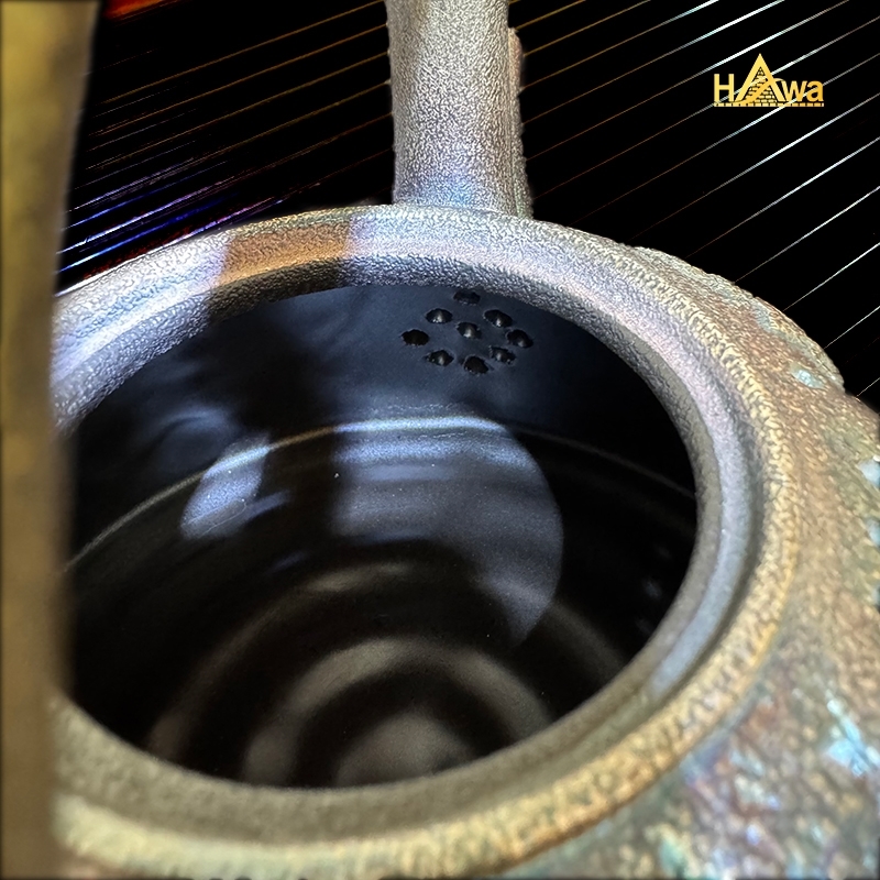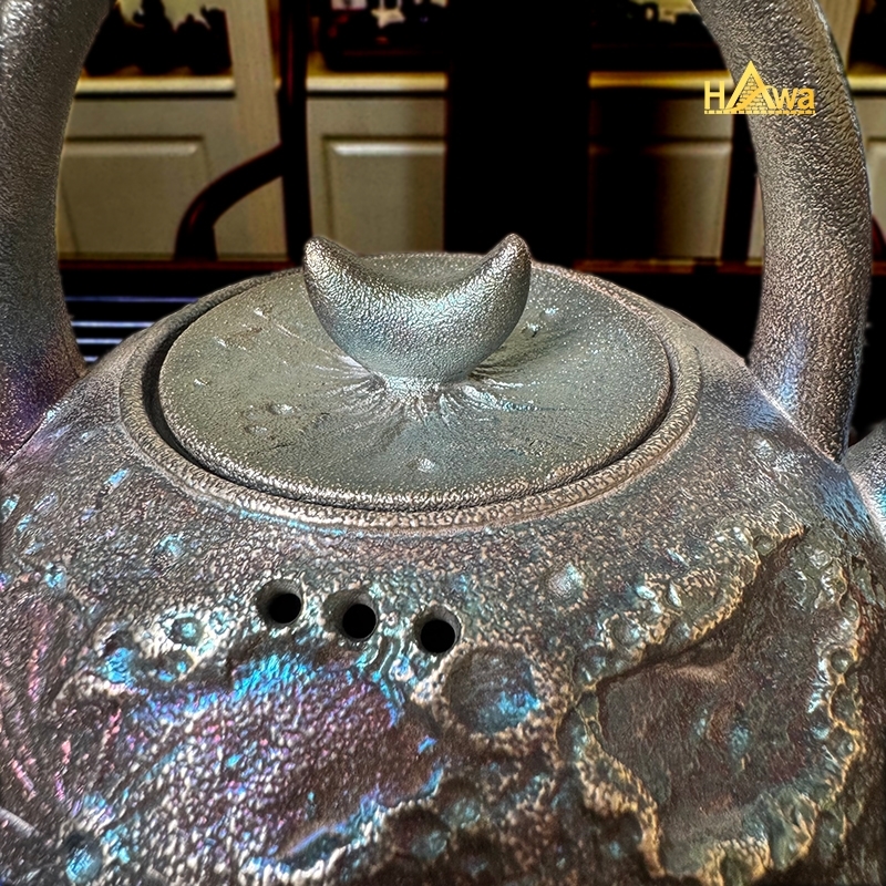 Khoáng bạc đen bám trên thân ấm, tạo nên những vân nổi tự nhiên như địa tầng cổ. Ánh kim trầm lắng, không rực rỡ, mà sâu và tĩnh – đúng tinh thần của người uống trà lâu năm.