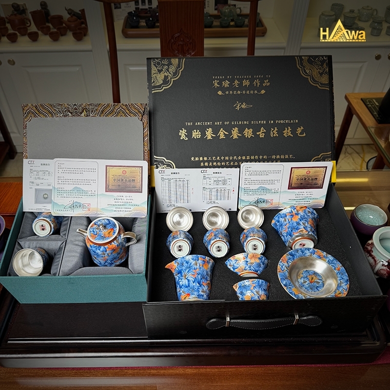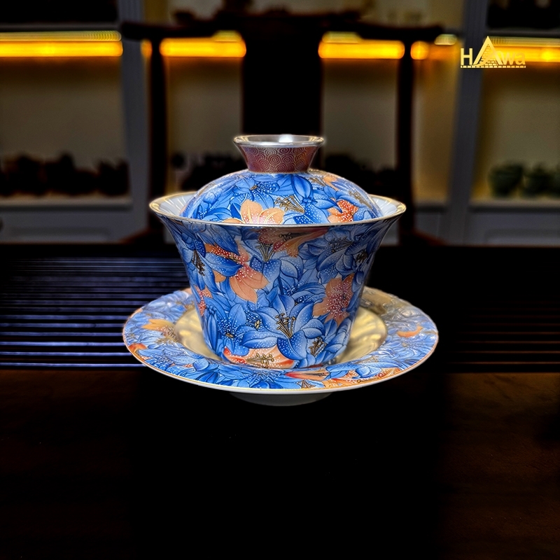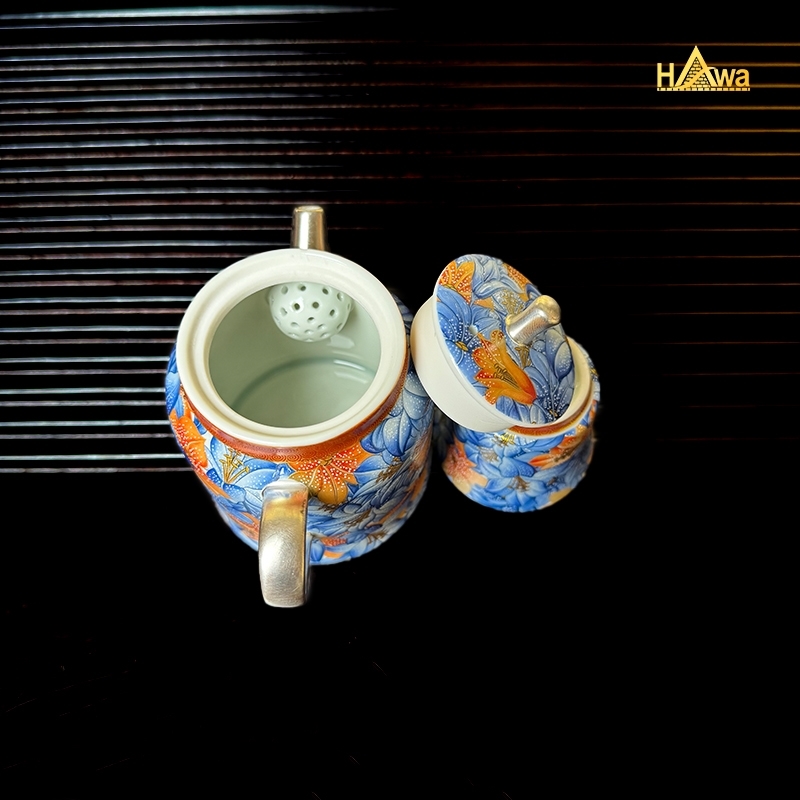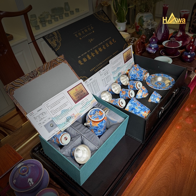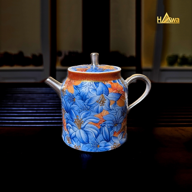 Bộ ấm chén sứ vẽ tay mạ bạc màu xanh không chỉ dành cho những buổi trà thường nhật, mà còn là điểm nhấn cho không gian phòng trà, phòng khách sang trọng – nơi người chơi trà tìm thấy sự tĩnh tại giữa nhịp sống hiện đại.