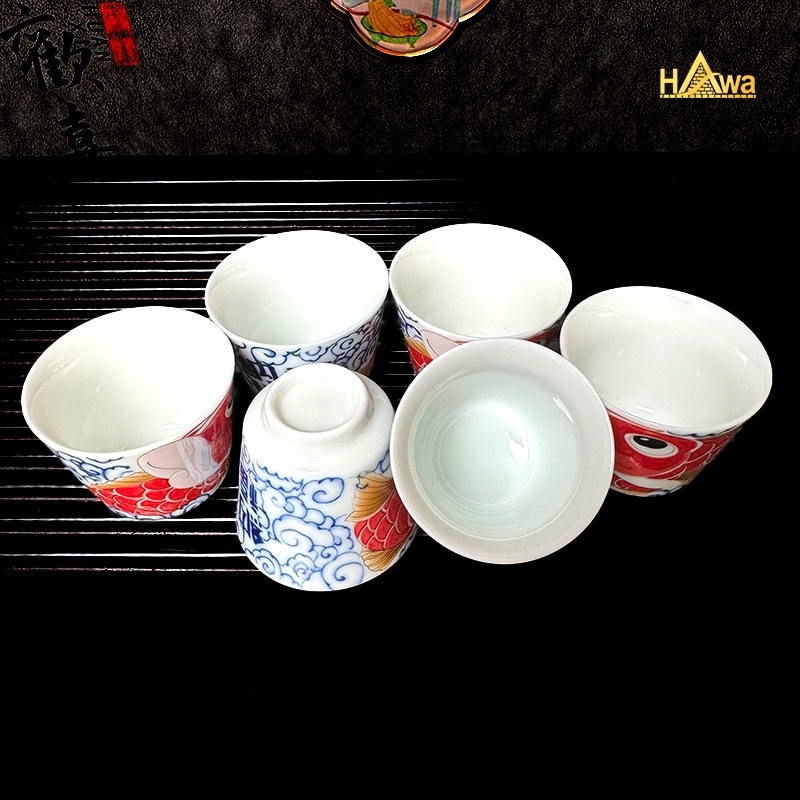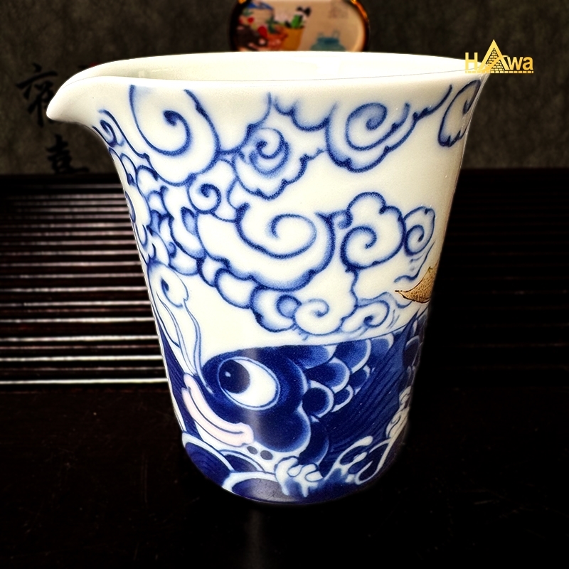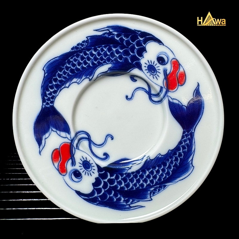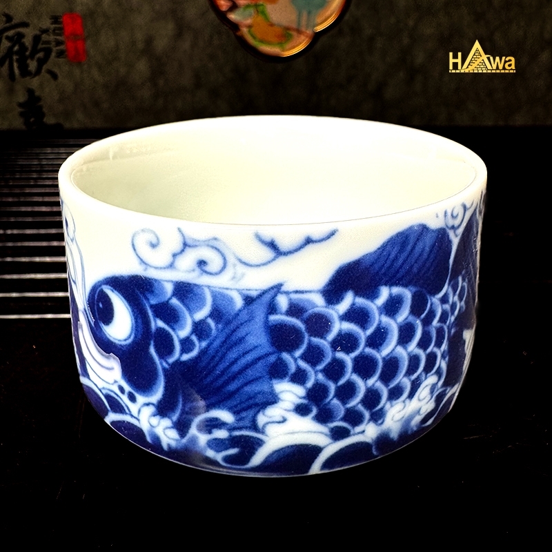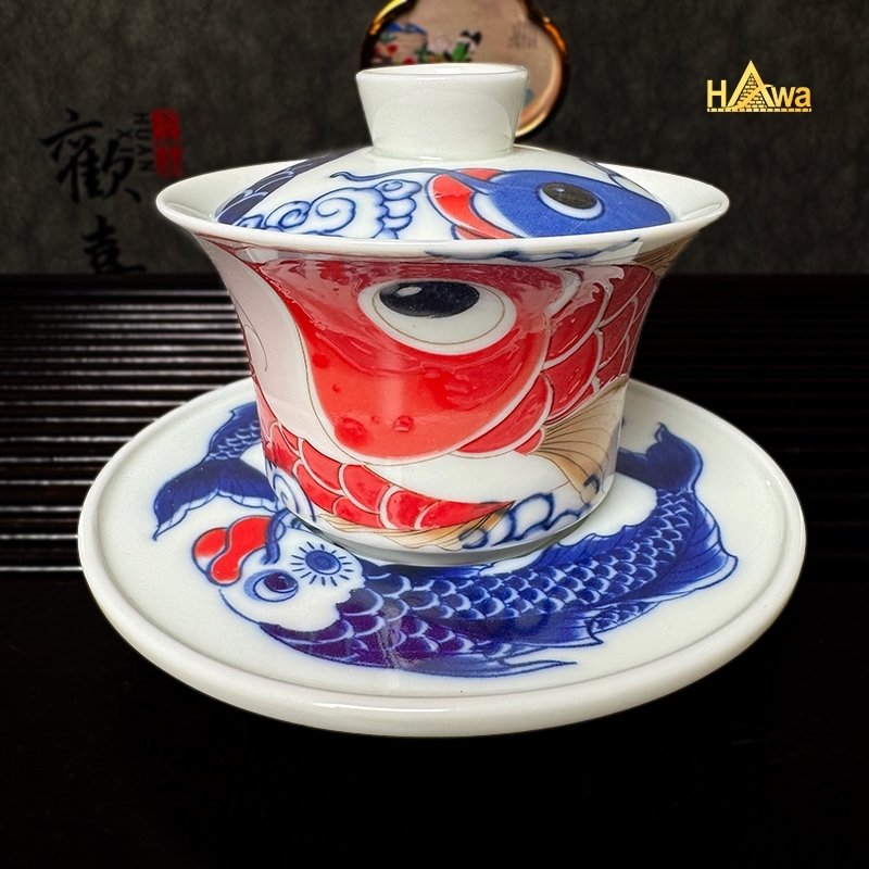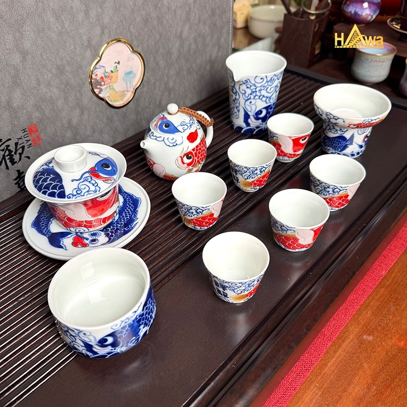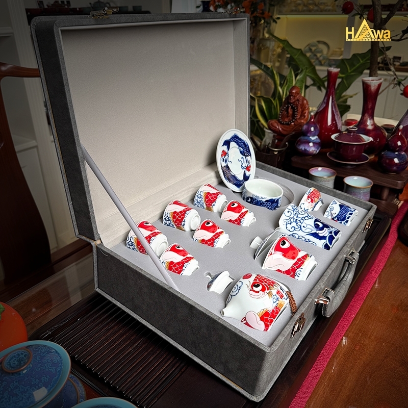 Sắc lam Thanh Hoa cổ điển kết hợp điểm nhấn đỏ rực tượng trưng cho may mắn và thành công. Mỗi chén trà như một lát cắt của câu chuyện vượt sóng, vượt thác – càng uống càng cảm nhận rõ tinh thần bền bỉ và sự tĩnh tại trong tâm.