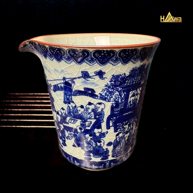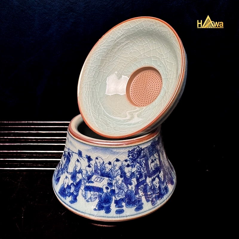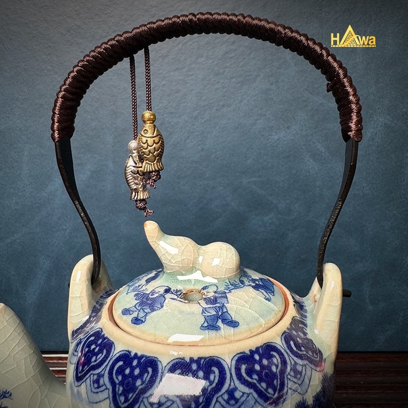 Họa tiết Bách Nhi được vẽ tay thủ công, nét lam trầm, bố cục chặt chẽ, biểu trưng cho phúc khí, con cháu sum vầy, gia đạo hưng thịnh. Đây là họa tiết thường xuất hiện trong các bộ trà dùng tiếp khách hoặc làm quà biếu mang ý nghĩa cát tường.