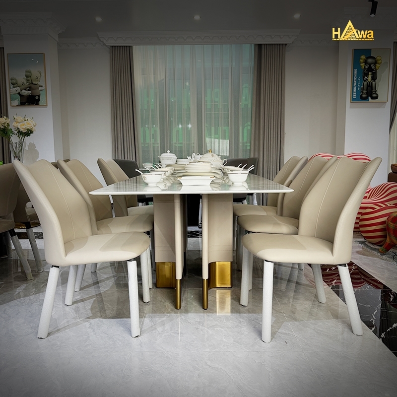 • Ghế ăn bọc da cao cấp: Chất da mềm mại, êm ái, dễ lau chùi, tạo cảm giác thoải mái khi ngồi lâu.
