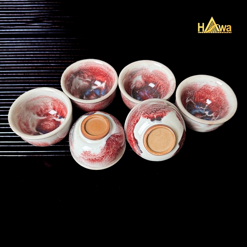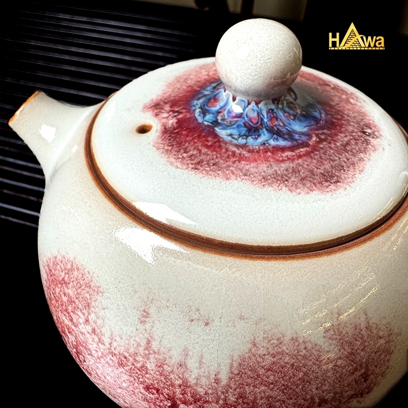 Bộ trà dáng ấm Tây Thi mềm mại, sứ Lang Diêu nung lửa cao tạo hiệu ứng trắng – hồng hỏa biến tự nhiên. Giữ nhiệt tốt, pha trà tròn vị, mỗi bộ là một bản men độc nhất.