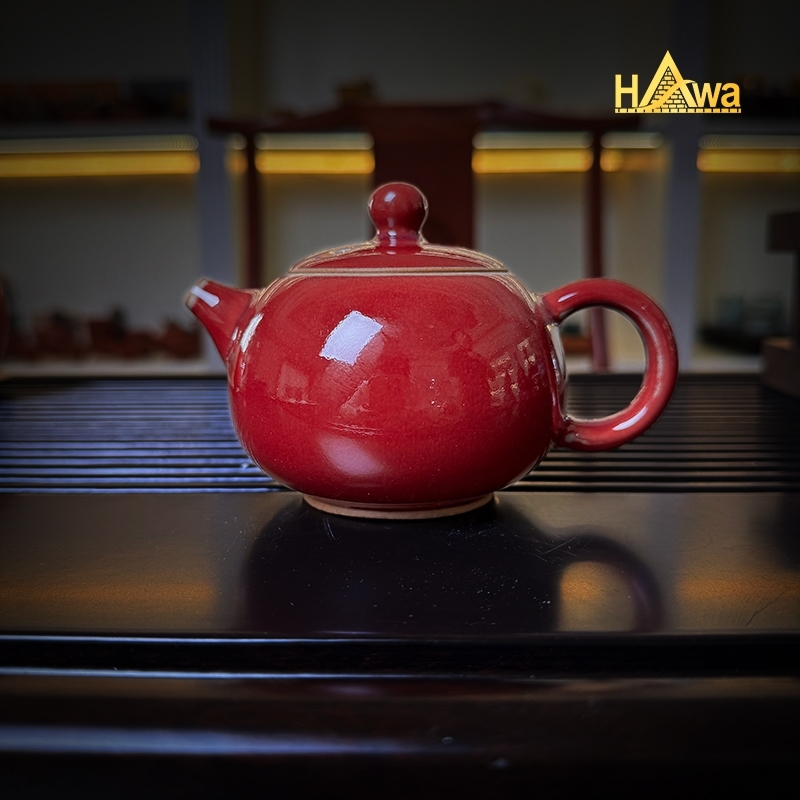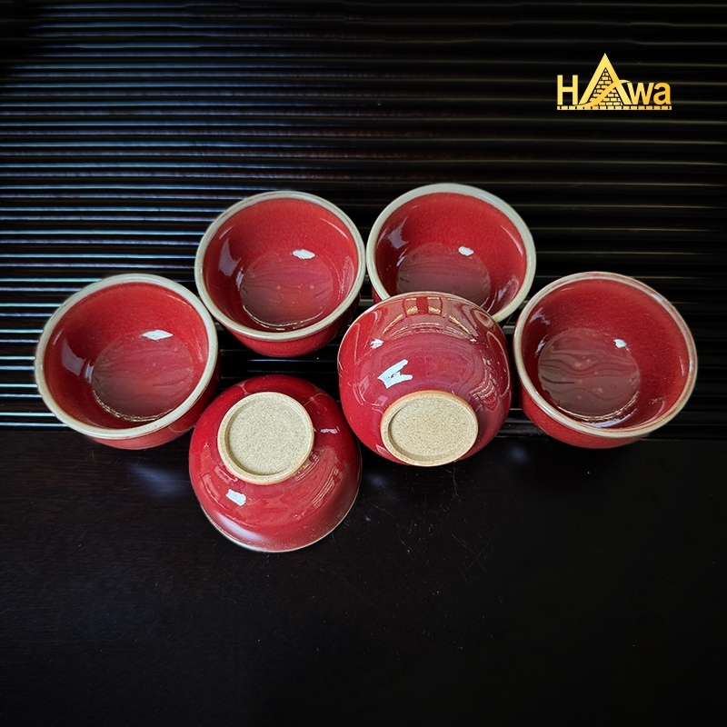 Bộ Trà Đạo Sứ Lang Diêu 7 Món, Mẫu 4 (SLD-BTD-7-M4) được chế tác từ sứ nung nhiệt độ cao, phủ lớp men Lang Diêu đỏ truyền thống, màu men tươi, ánh nhẹ, tạo cảm giác ấm áp và trang nhã khi thưởng trà.