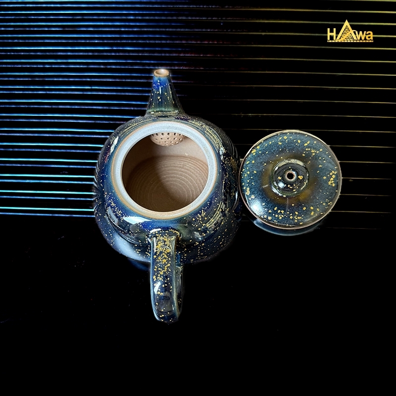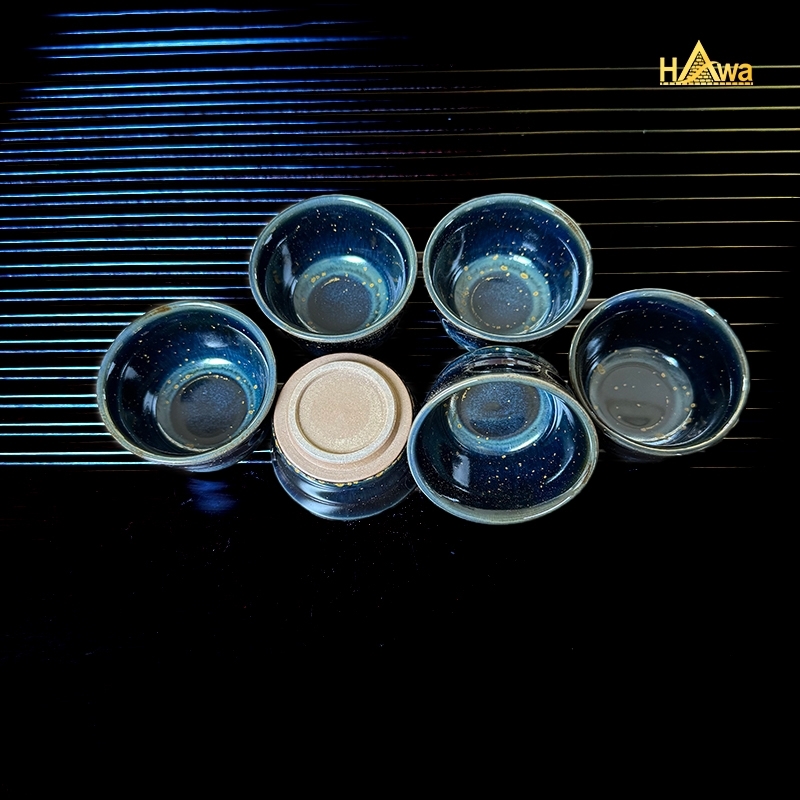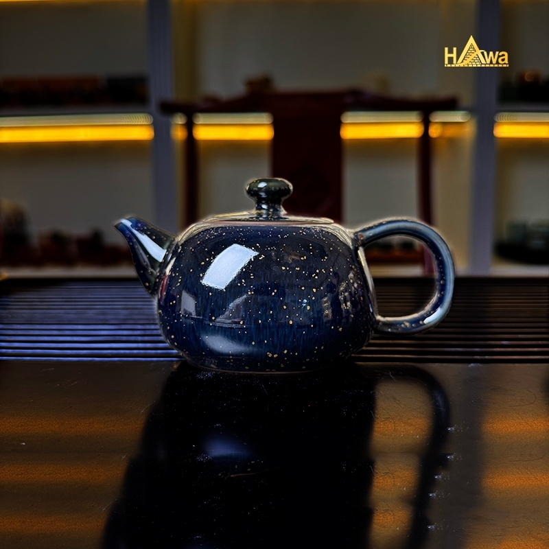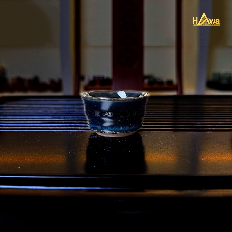 Bộ trà đạo sứ Lang Diêu 7 món – xanh than mẫu 1 mang sắc men trầm sâu, gợi cảm giác bình yên như đêm lặng, như khoảng dừng giữa nhịp sống vội vàng. Lớp men Lang Diêu loang nhẹ tự nhiên, không bộ nào giống bộ nào, tạo nên vẻ đẹp độc bản, mộc mạc mà sang.