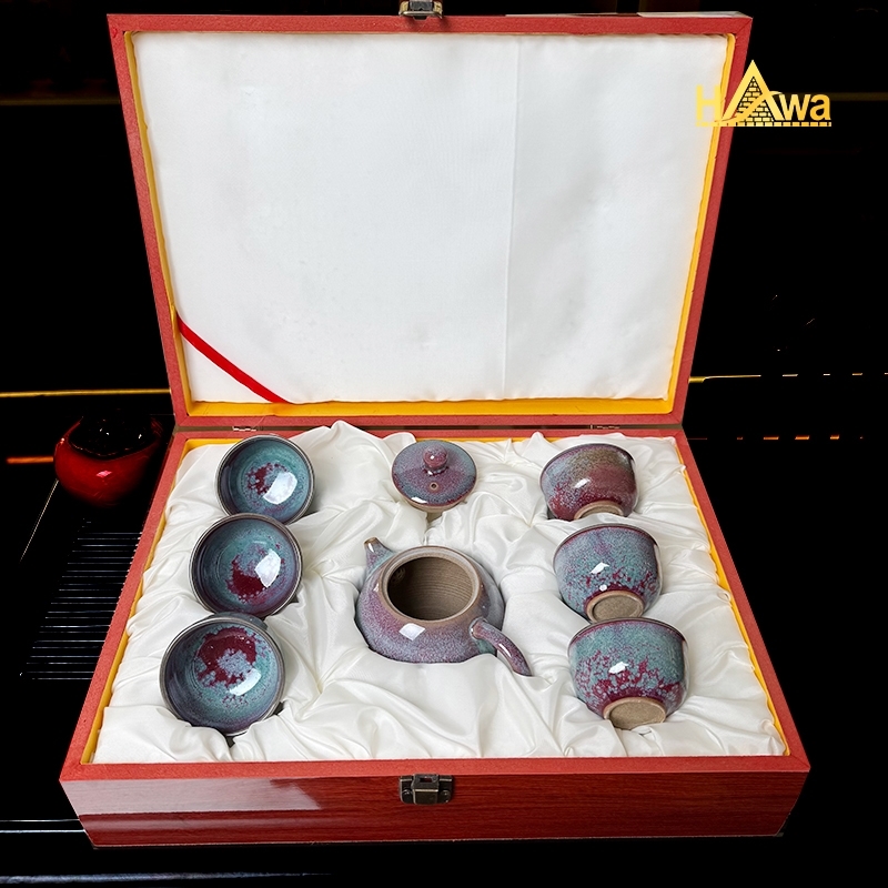 Ấm Chén Trà Đạo Men Rạn Vẽ Hoa Dâu Viền Vàng (BTD-HX1)