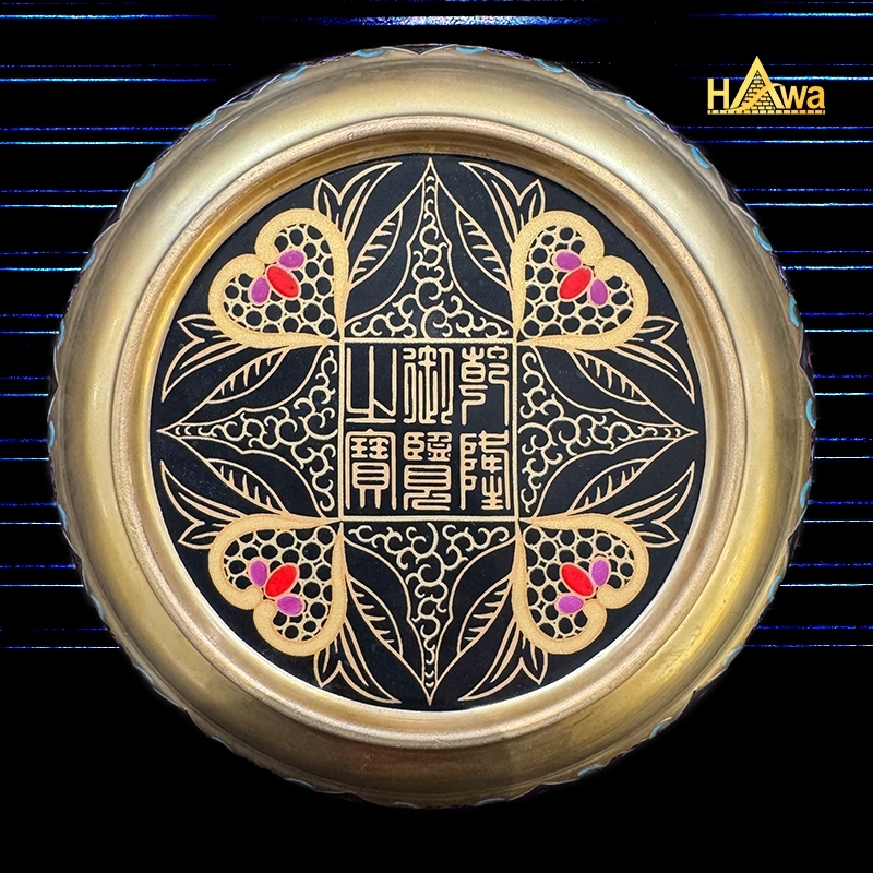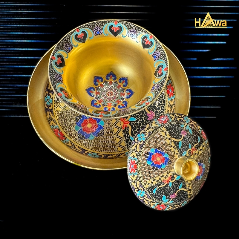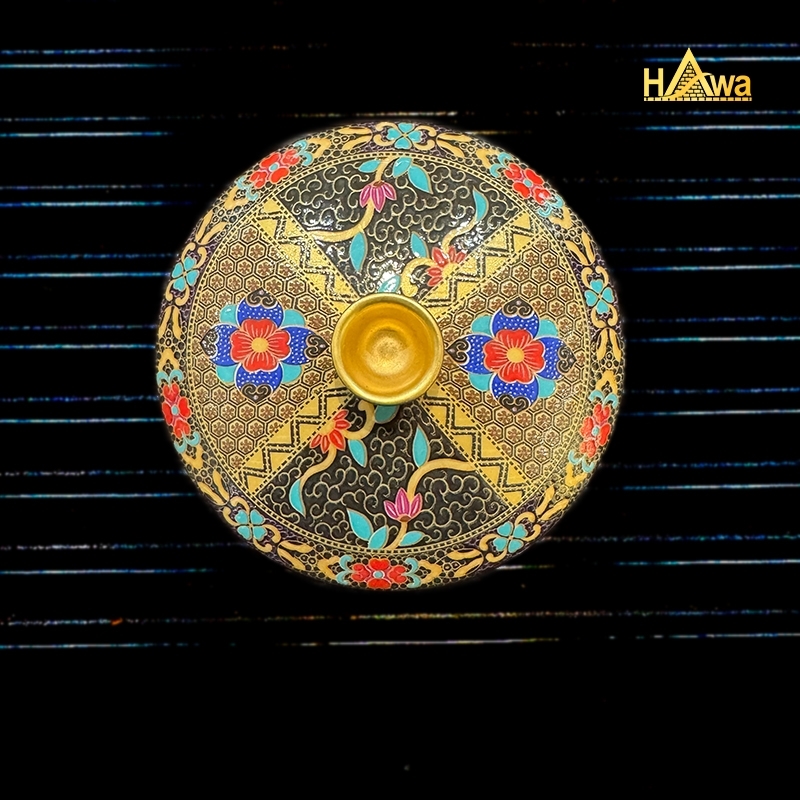 Toàn bộ thân khải và đĩa lót được trang trí bằng các hoa văn hình học và hoa lá cát tường, phối màu lam – đỏ – xanh ngọc nổi bật trên nền vàng sẫm, tạo chiều sâu thị giác và cảm giác sang trọng khi đặt trên bàn trà. Mỗi sản phẩm là một tác phẩm độc bản, thể hiện tay nghề và sự tỉ mỉ của nghệ nhân.