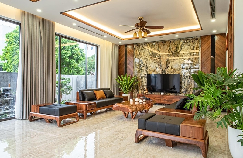 + Sofa lớn kiểu dáng hiện đại, bọc vải hoặc da, kết hợp bàn trà rộng đáp ứng nhu cầu sum họp.